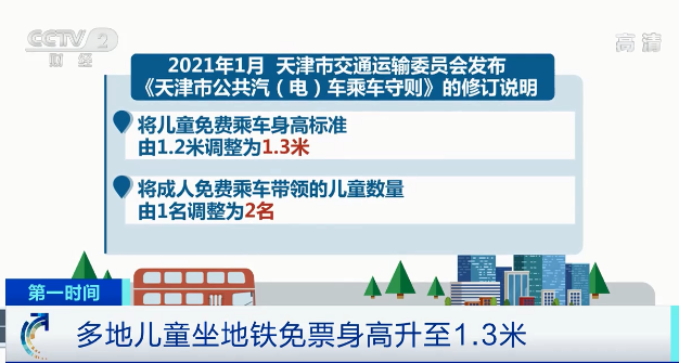 今年1月,天津市交通运输委员会也发布《天津市公共汽(电)车乘车守则》的修订说明。将儿童免费乘车身高标准由1.2米调整为1.3米,并将成人免费乘车带领的儿童数量由1名调整为2名。