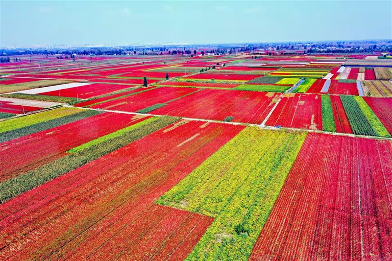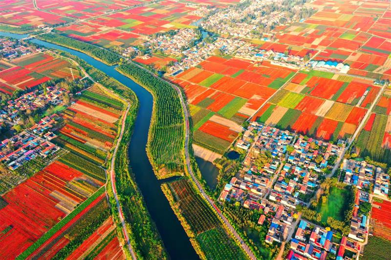 近日,山东省金乡县40万亩辣椒喜获丰收,从高空俯瞰,成片的辣椒组成红彤彤的美丽画卷,让人惊叹。