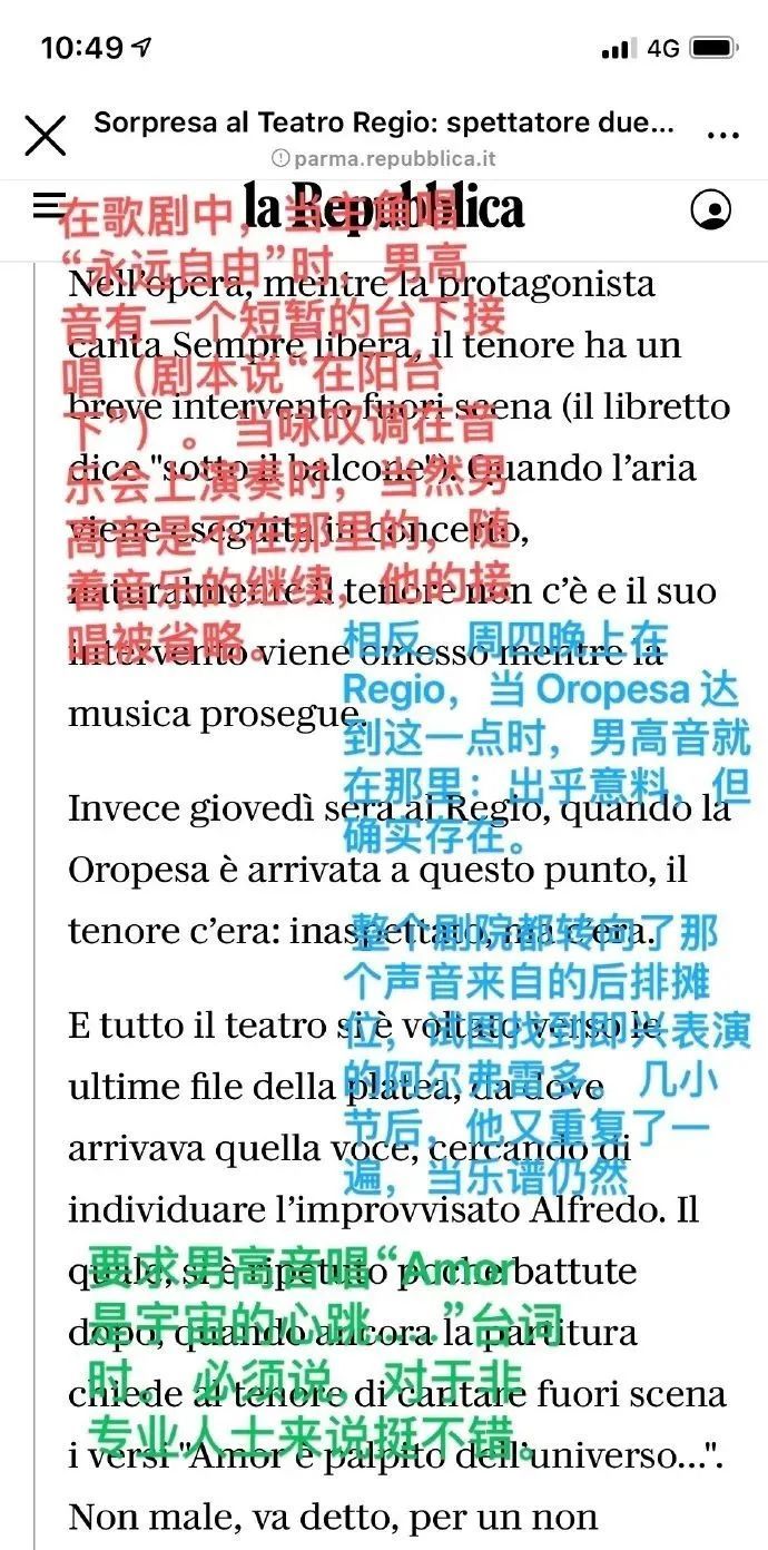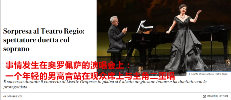 当地时间10月8日,美国女歌唱家奥罗佩萨(Lisette Oropesa)在意大利演出时,由于观众反应热情,于是临时决定返场演唱《茶花女》片段。但由于事先并没有计划演唱这首歌,因此在中间的男高音部分未安排助唱。