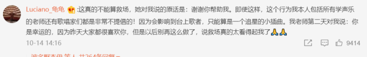 对于这次美丽的小意外,刘建伟在微博上谦虚地表示:“这真的不能算救场,她对我说的原话是:谢谢你帮助我。即使这样,这个行为我本人包括所有学声乐的老师还有歌唱家们都是非常不提倡的!因为会影响到台上歌者,只能算是一个追星的小插曲。”
