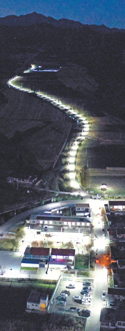 夜晚,路灯照亮下营子村蜿蜒的村道。