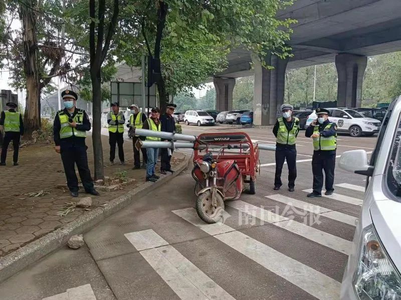 当天下午1时30分左右,由城管、交警组成的柳北区城管执法局五车整治联合执法组,巡查至胜利路双冲桥底时,看到一辆红色的三轮车,装载着两根长长的铁管,由东往西方向晃晃悠悠驶来,让人看了不由得捏了一把汗。随队整治的交警依法将其拦停路边检查。