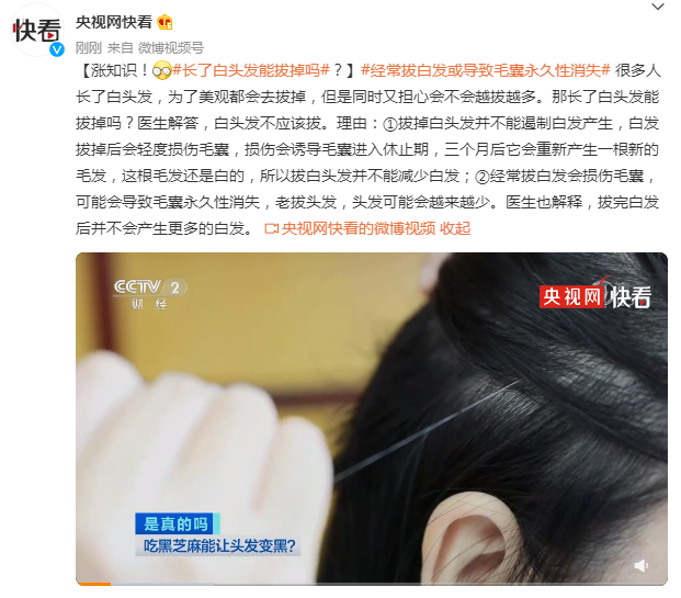 【涨知识!#长了白头发能拔掉吗#?】#经常拔白发或导致毛囊永久性消失# 很多人长了白头发,为了美观都会去拔掉,但是同时又担心会不会越拔越多。那长了白头发能拔掉吗?医生解答,白头发不应该拔。理由:①拔掉白头发并不能遏制白发产生,白发拔掉后会轻度损伤毛囊,损伤会诱导毛囊进入休止期,三个月后它会重新产生一根新的毛发,这根毛发还是白的,所以拔白头发并不能减少白发;②经常拔白发会损伤毛囊,可能会导致毛囊永久性消失,老拔头发,头发可能会越来越少。医生也解释,拔完白发后并不会产生更多的白发。