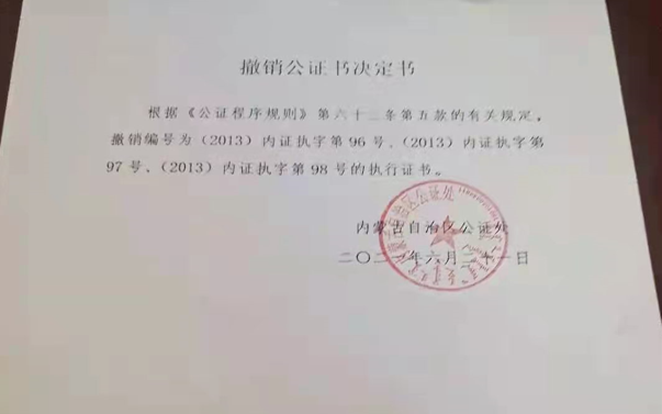 直到今年6月,内蒙古自治区公证处在全自治区司法行政系统队伍教育整顿自查自纠中发现了武君反映的问题,撤销了当年的执行证书。