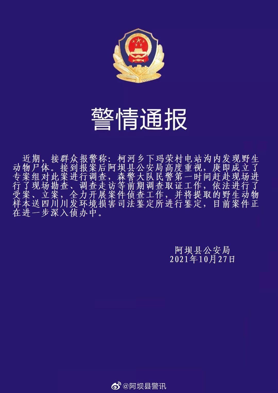 对此,10月27日晚,阿坝县警方通过官方微博回应称,近期接群众报警,在阿坝县柯河乡下玛荣村电站沟内发现野生物尸体,接到报案后阿坝县公安局高度重视,赓即成立了专案组对此案进行调查。森警大队民警第一时间赶赴现场进了现场勘查、调查走访等前期调查取证工作,依法进行了受案、立案,目前正在全力开展案件侦查工作。