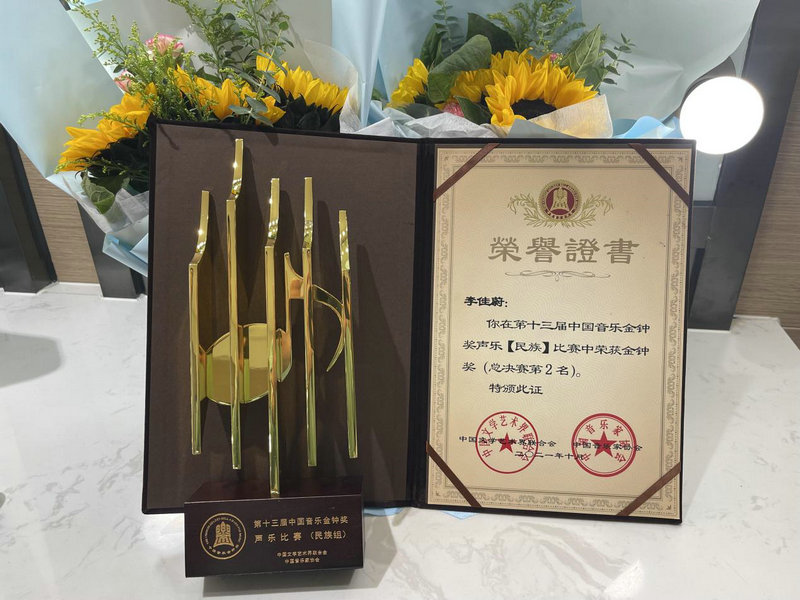 近日,第十三届中国音乐金钟奖圆满落下帷幕,比赛中上海音乐家协会选送的青年歌唱家李佳蔚不负众望一路过关斩将,摘得第十三届中国音乐金钟奖民族唱法第二名的佳绩。中国音乐金钟奖创办于2001年,是由中共中央宣传部批准设立、由中国文联和中国音协共同主办的中国音乐界综合性专家大奖,每两年举办一届,是全国唯一常设的音乐界综合性大奖,与戏剧梅花奖、电视金鹰奖、电影金鸡奖并列的艺术大奖,此前已举办12届。舞台之上,李佳蔚唱法精湛,大气自信,舞台之下,她聪敏好学,才华横溢。几年来,一次次大奖和沉甸甸的荣誉见证了李佳蔚的成长,面对鲜花与奖杯,她所承载的不仅是众人的殷殷期盼,更多的是自己对自己的检验与挑战。