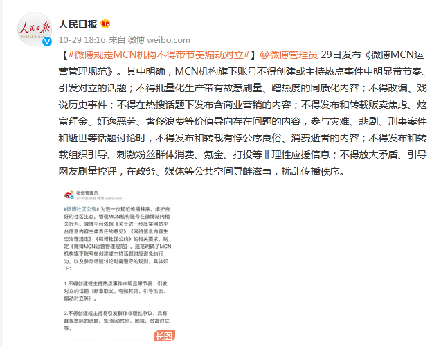 【微博规定MCN机构不得带节奏煽动对立】@微博管理员29日发布《微博MCN运营管理规范》。其中明确,MCN机构旗下账号不得创建或主持热点事件中明显带节奏、引发对立的话题;不得批量化生产带有故意刷量、蹭热度的同质化内容;不得改编、戏说历史事件;不得在热搜话题下发布含商业营销的内容;不得发布和转载贩卖焦虑、炫富拜金、好逸恶劳、奢侈浪费等价值导向存在问题的内容,参与灾难、悲剧、刑事案件和逝世等话题讨论时,不得发布和转载有悖公序良俗、消费逝者的内容;不得发布和转载组织引导、刺激粉丝群体消费、氪金、打投等非理性应援信息;不得放大矛盾、引导网友刷量控评,在政务、媒体等公共空间寻衅滋事,扰乱传播秩序。