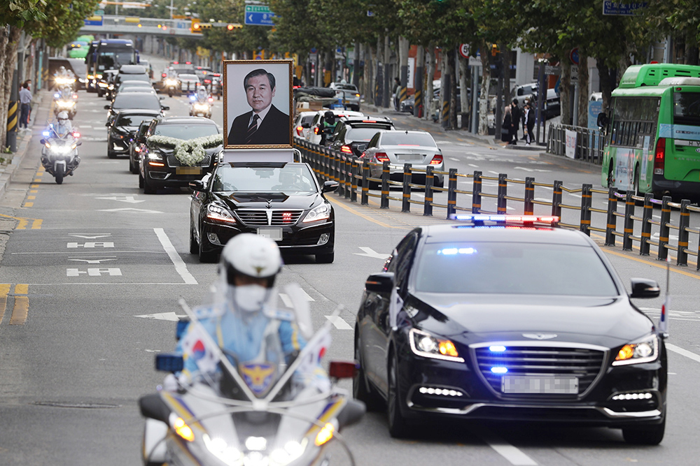 当地时间2021年10月30日,韩国首尔,韩国前总统卢泰愚的遗体告别仪式,车队护送遗体和遗像。澎湃影像 图