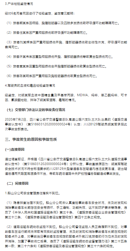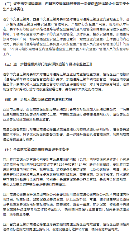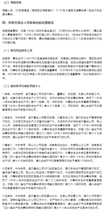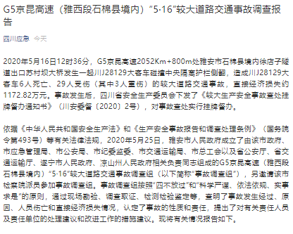 2021年11月1日,四川省应急厅公布G5京昆高速(雅西段石棉县境内)“5·16”较大道路交通事故调查报告 :2020年5月16日12时36分,G5京昆高速2052Km+800m处雅安市石棉县境内徐店子隧道出口苏村坝大桥发生一起川J28129大客车碰撞中央隔离护栏侧翻,造成川J28129大客车6人死亡、29人受伤(其中3人重伤)的较大道路交通事故,直接经济损失约1172.82万元。调查报告显示,通过调查取证,并根据《四川省公安厅交通警察总队高速公路六支队三大队道路交通事故认定书》(第5186031202000000024号)分析认定,事故直接原因为:胡某军驾驶安全技术状况不符合标准要求的川J28129大型普通客车在隧道内违法变更车道,驶出隧道后遇雨天路面潮湿操作不当,导致车辆与道路中央护栏相撞后侧翻造成事故发生。