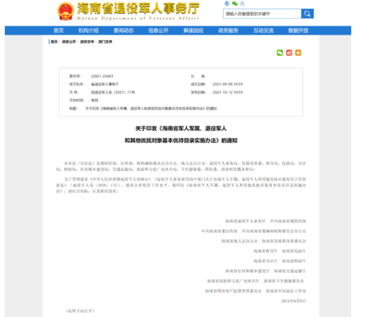 记者近日从海南省退役军人事务厅获悉,海南省退役军人事务厅联合16部门印发了《海南省军人军属、退役军人和其他优抚对象基本优待目录实施办法》及《优待目录清单》,对现役军人、现役军人家属、残疾军人、退役军人及“三属”(烈属、因公牺牲军人遗属、病故军人遗属)等5类人员,明确建立优待证制度,明确优待项目。