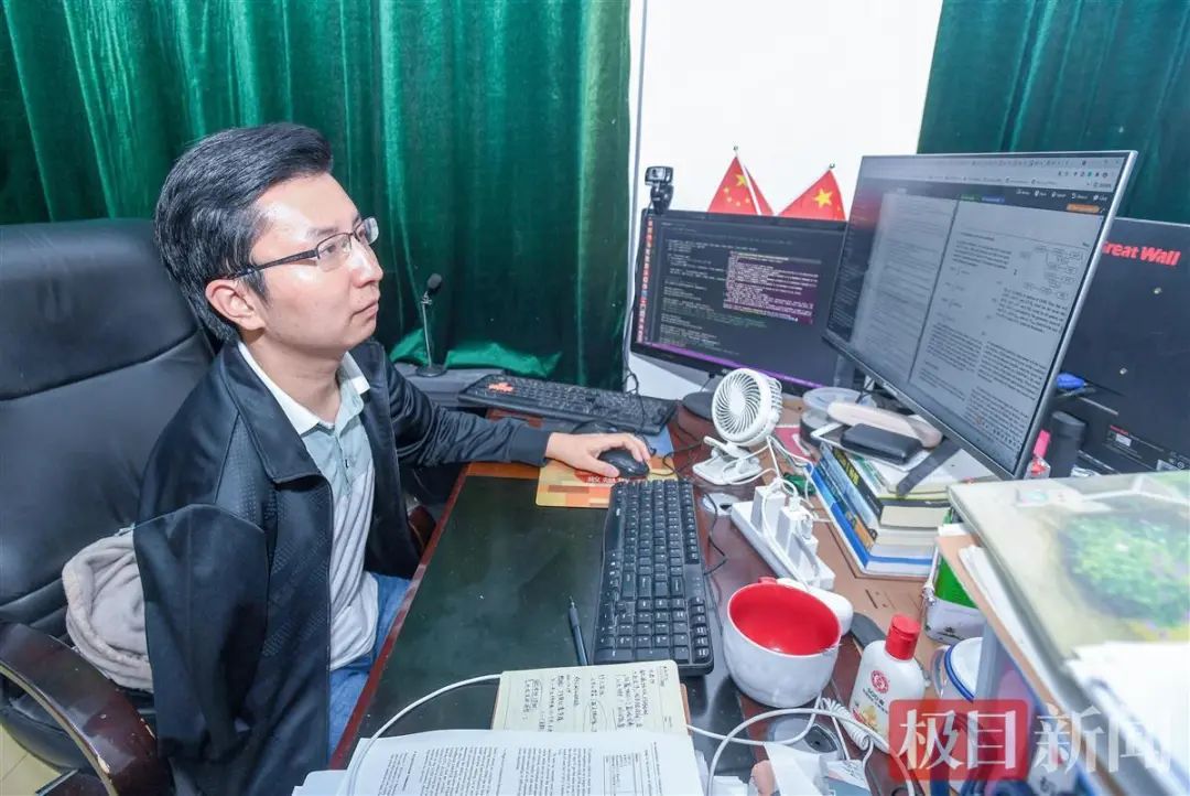 在实验室袁鑫的座位案头,一台电脑闪烁着密密麻麻的程序代码,一台电脑桌面上缀满了文件资料;一摞书本笔记与电脑一般高。他解释,把专业代码和办公区域分开能更加高效,同时书本知识也十分重要。