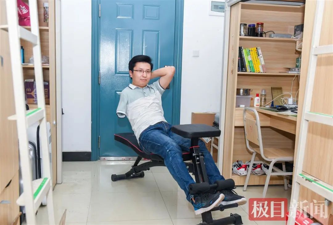 袁鑫的宿舍里,有一个仰卧板,空余时间,他会一次做上100个仰卧起坐。