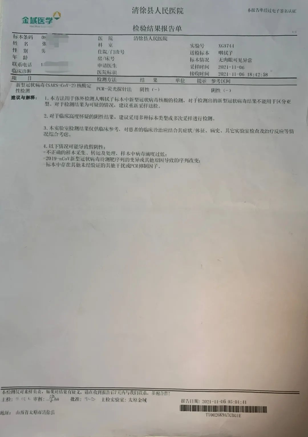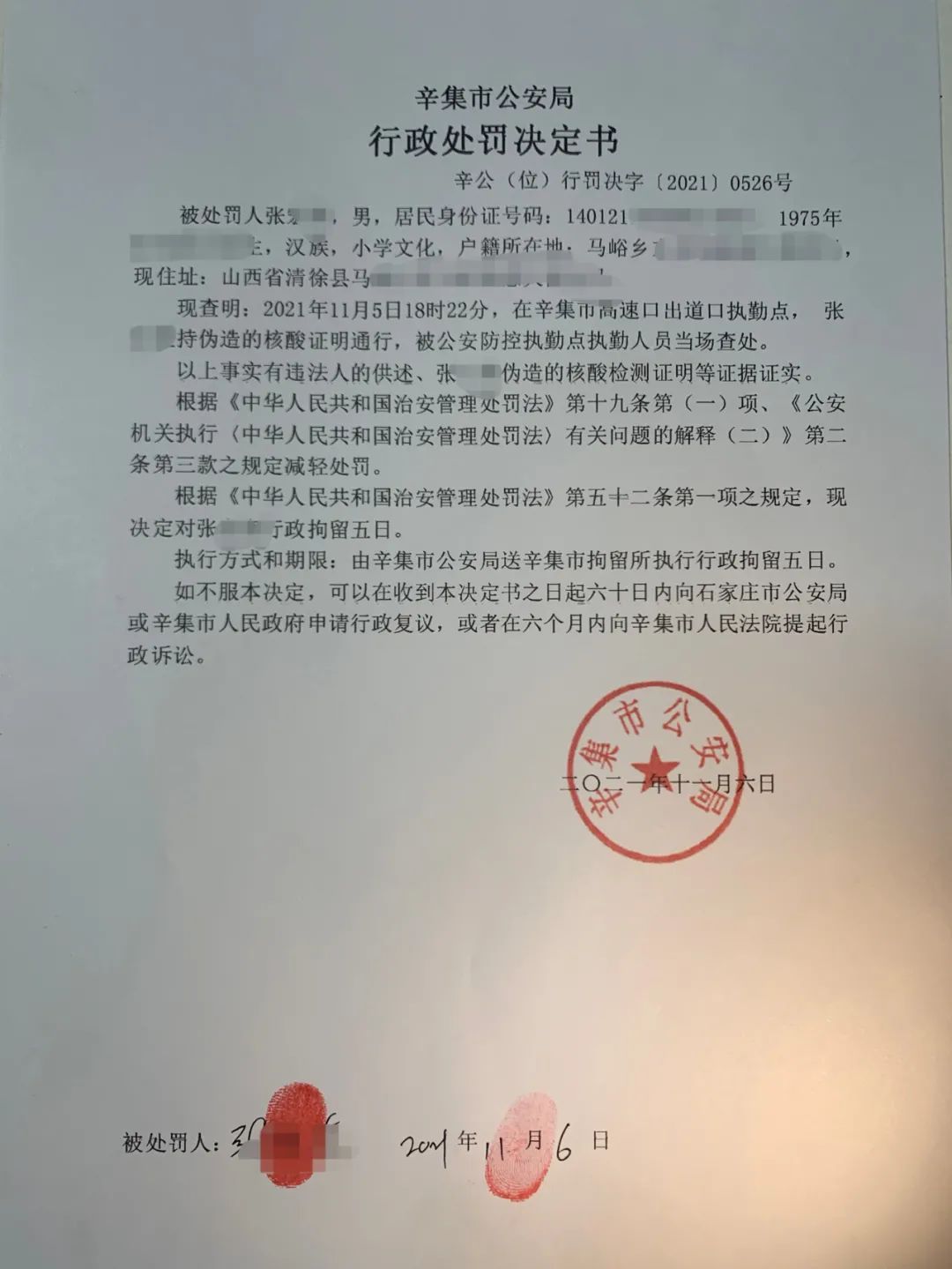 2021年11月5日18时22分,民警在辛集市高速口出道口执勤时发现,张某某(男,46岁,山西省清徐县人)持伪造的核酸证明通行,被公安防控执勤点执勤人员当场查处。