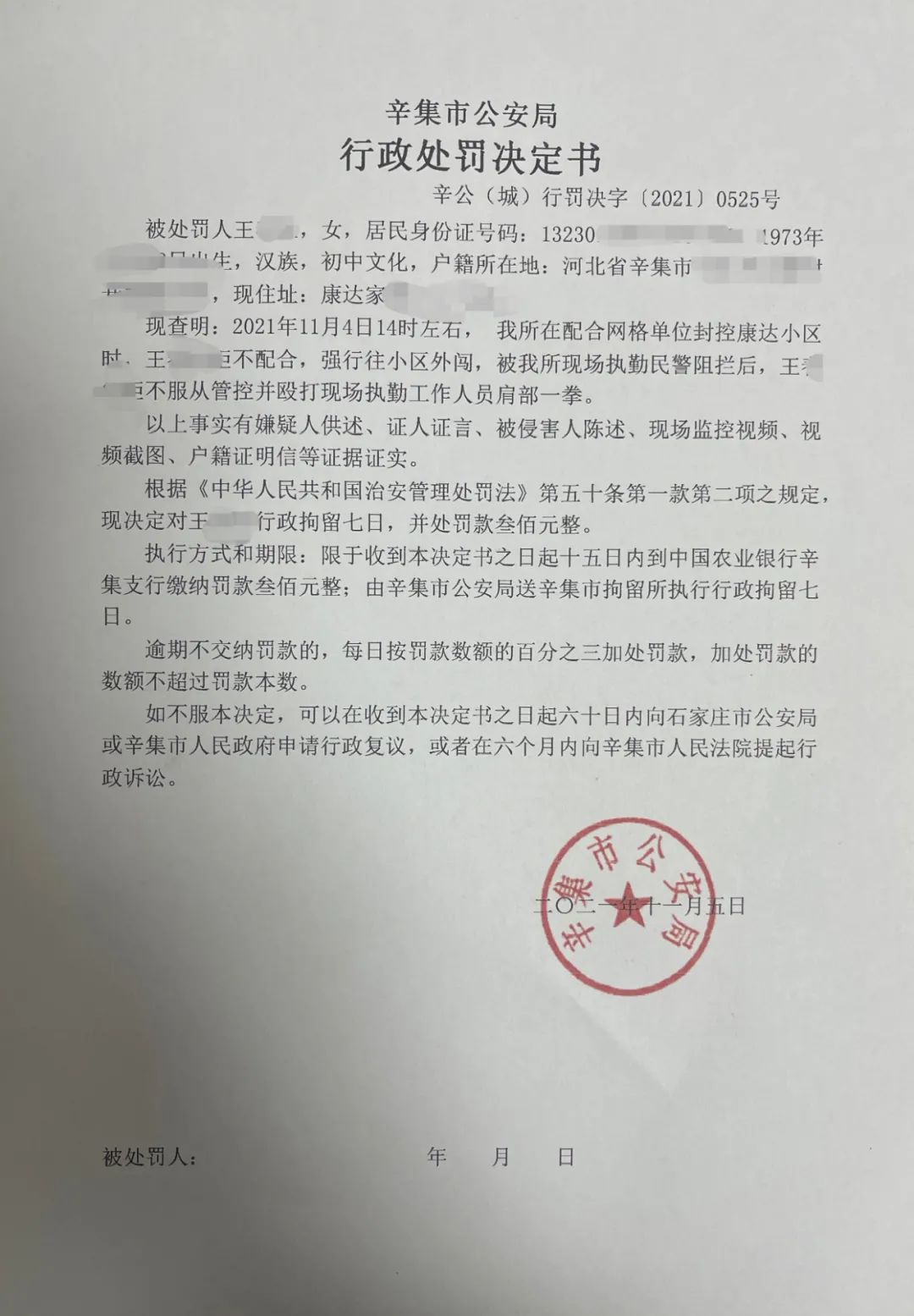 2021年11月4日14时左右, 康达家园小区居民王某某(女,48岁,辛集市马庄乡人)拒不配合管控,强行往小区外闯,被现场执勤民警阻拦后,拒不服从管控,并殴打现场执勤工作人员,造成不良社会影响。