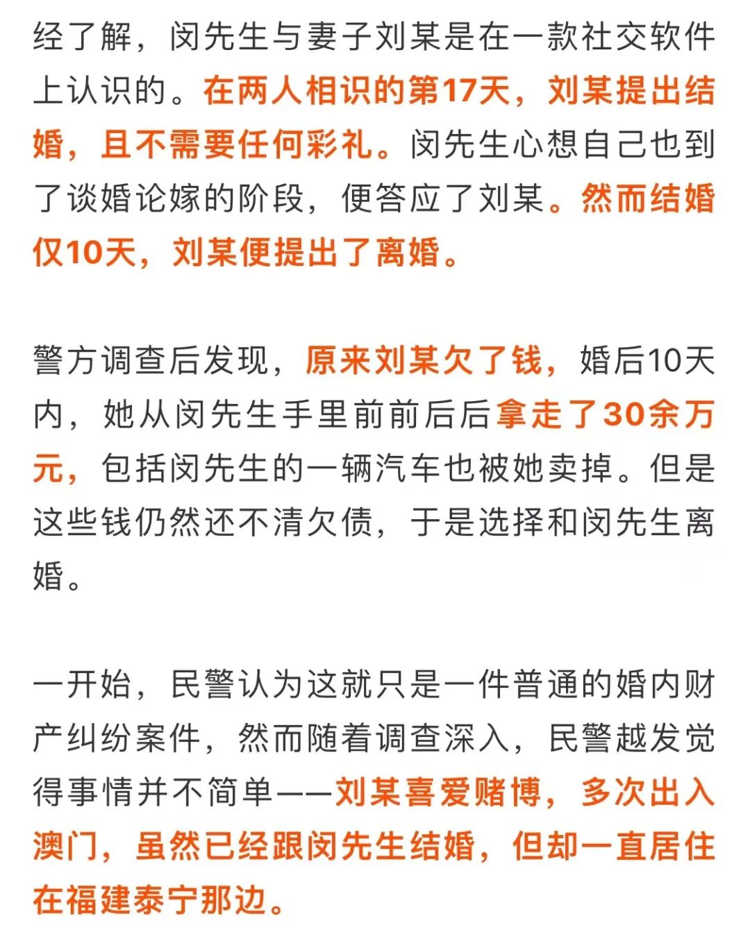前不久,宁波北仑公安分局霞浦派出所接到市民闵先生报警称,自己被妻子骗婚,损失30余万元,希望警方可以帮助他将钱财追回来。