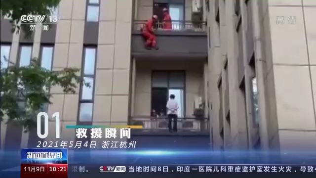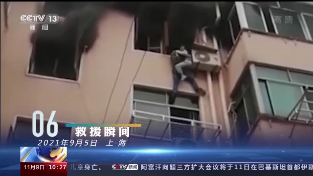 一个身影从楼下的窗口钻出,顺着护栏、排水管,向上攀爬。窗户上沿只有2厘米宽,还要承托孩子,所有人心都提到了嗓子眼。