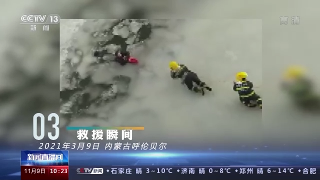 拉起落水者的一刹那,脆弱的冰面瞬间坍塌,消防员落入冰冷的河水。艰难地爬出冰面,消防员做好防护,临危不乱,利用绳索拉拽和担架的浮力将被困者救出上岸。