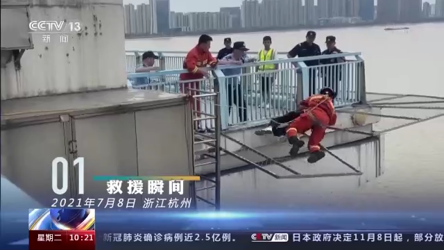 男子持刀站在观景台外的护栏上,脚下就是滚滚的钱塘江。隐蔽处,两名消防员暗自约好了行动信号。反复劝说下,男子扔了刀。