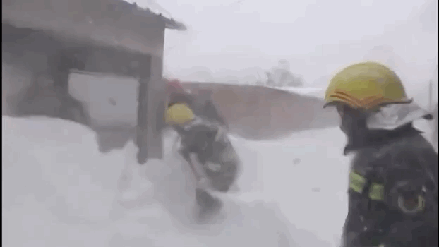 8日,辽宁鞍山一辆救护车在出行路上被暴雪拦路,无法通行。消防员用手挖、肩推等方式,合力清理出生命通道。