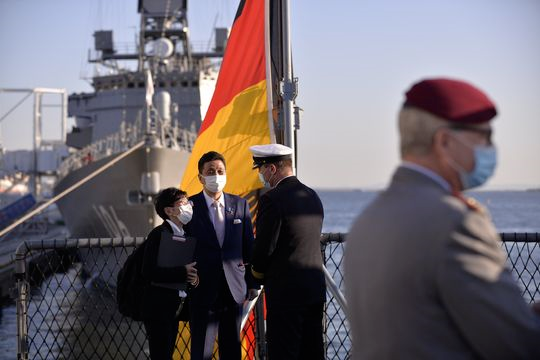 资料图:登上德国“巴伐利亚”号护卫舰的日本防卫大臣岸信夫(新华网)