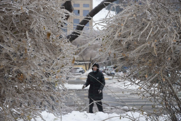 2021年11月8日,哈尔滨迎来雨雪冰冻天气,一名市民在观看结冰的树木。 新华社记者 张涛摄