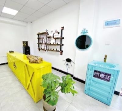 记者观察到,健身区域的墙上,绘有停车警示线的标记、幽默的文创风格标语、彩绘铁皮汽油桶的桌椅;集装箱式的彩色吧台旁,墙面立柱被人工凿出凹凸不平的效果,挂着复古的铁艺壁灯;大屏幕前,一把由旧长椅手工打磨上漆改装成的青金石蓝靠椅特别醒目。