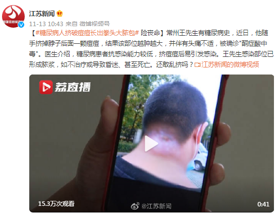 常州王先生有糖尿病史,近日,他随手挤掉脖子后面一颗痘痘,结果该部位越肿越大,并伴有头痛不适,被确诊"酮症酸中毒"。医生介绍,糖尿病患者抗感染能力较低,挤痘痘后易引发感染。王先生感染部位已形成脓浆,如不治疗或导致昏迷、甚至死亡。还敢乱挤吗?