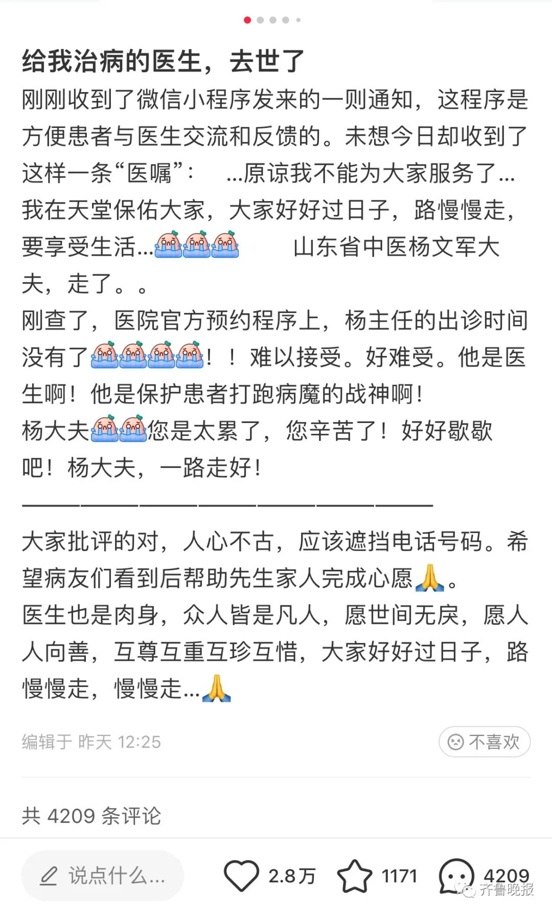 主任杨文军医生去世的消息