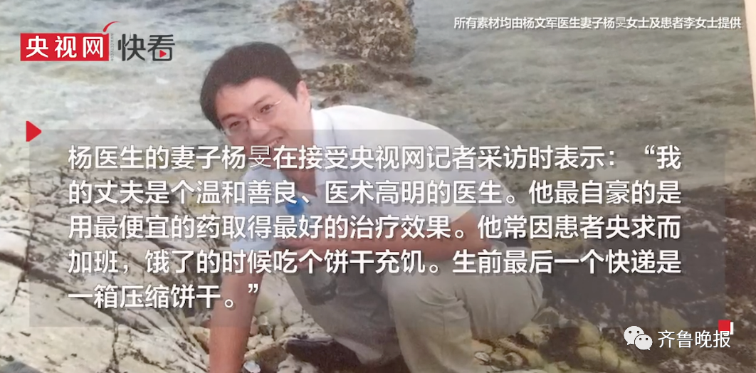 “我的丈夫是个温和善良、医术高明的医生。他最自豪的是用最便宜的药取得最好的治疗效果。他常因患者央求而加班,饿了的时候吃个饼干充饥。生前最后一个快递是一箱压缩饼干”。