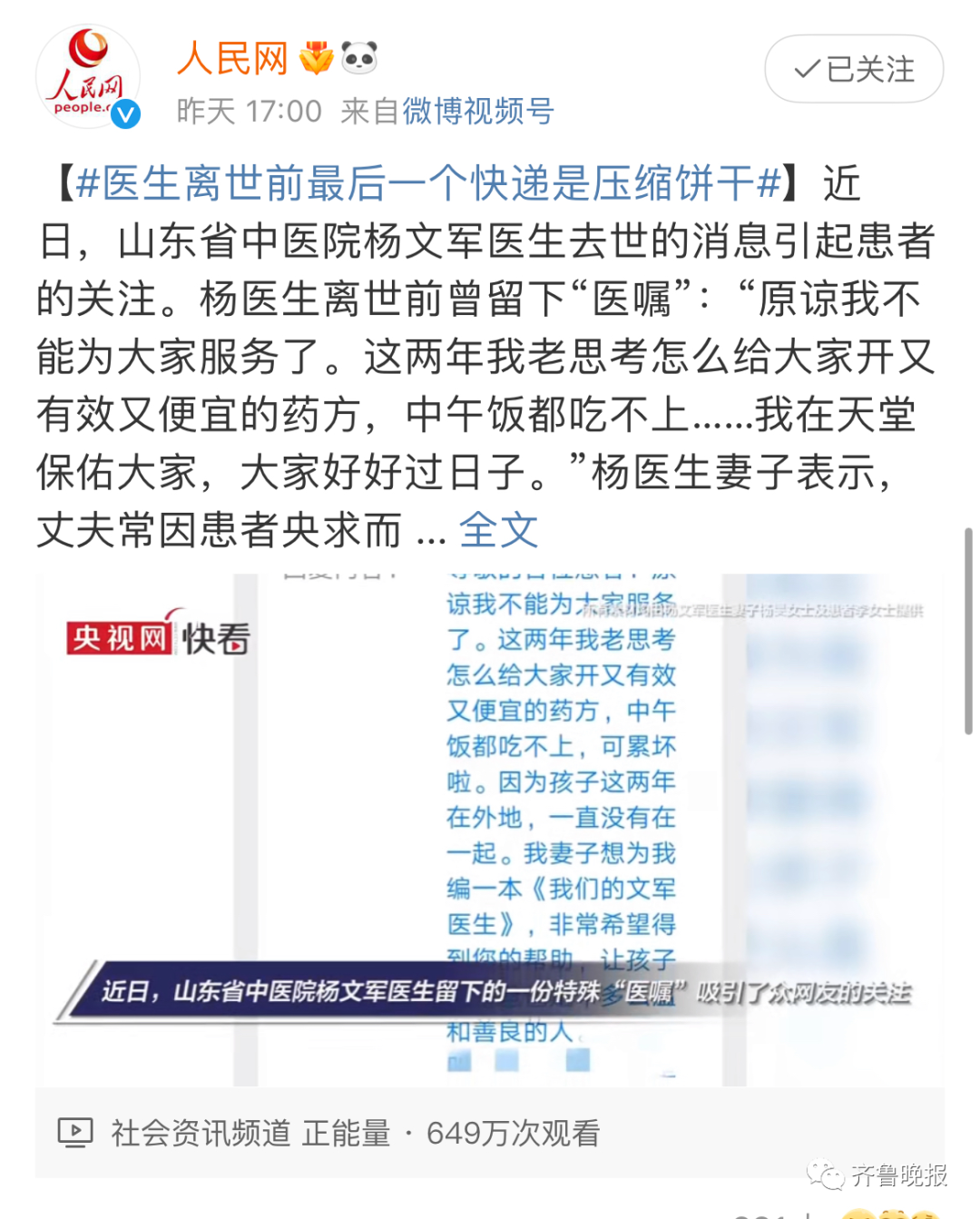 一则#医生离世前的最后一个快递是压缩饼干#