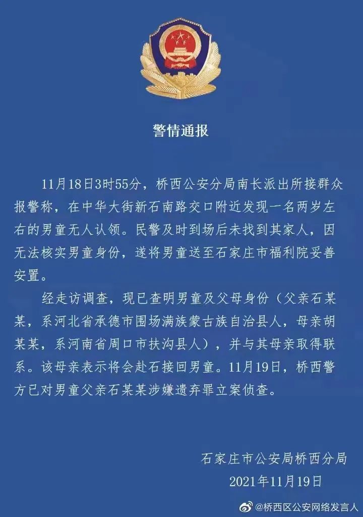 11月19日,石家庄市公安局桥西分局发布《警情通报》,孩子的父母已经找到,警方已对男童父亲石某某涉嫌遗弃罪立案侦查。