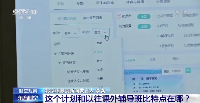 北京市教委新闻发言人 李奕:它不是很多人理解为的线上补课的项目,我们是在互联网这个背景下,为学生提供自主选择,有自己爱好偏好的这方面教师辅导资源。其实是在完成了校内的基本公共服务和课程服务之后,请一部分有优质教育服务属性的老师,在线上为更多孩子个性的发展,提供一些支撑。