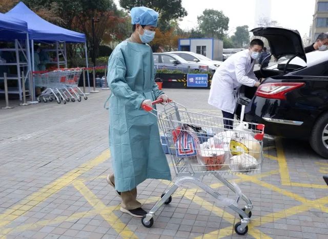 告知情况后,在北干街道疫情防控党员先锋岗值班的党员王先生马上联系物业,他找来一辆推车,把外卖小哥手中的物品送入小区,再由专人送入孕妇家中。