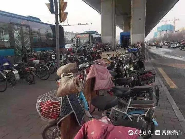 与之形成鲜明对比的是历山路与北园大街交叉口的一处通道,记者看到,都同样位于高架桥下且紧邻BRT站台,但这里并没有安装隔离。很多市民为了方便乘车,就把电瓶车直接停在了高架桥下和BRT出站口旁,造成了大面积的电动车、摩托车堆积,行人要想通行就必须绕过“车堆”,十分不方便。