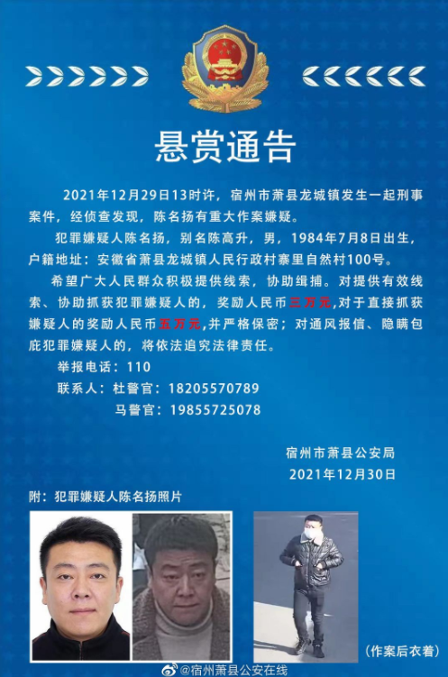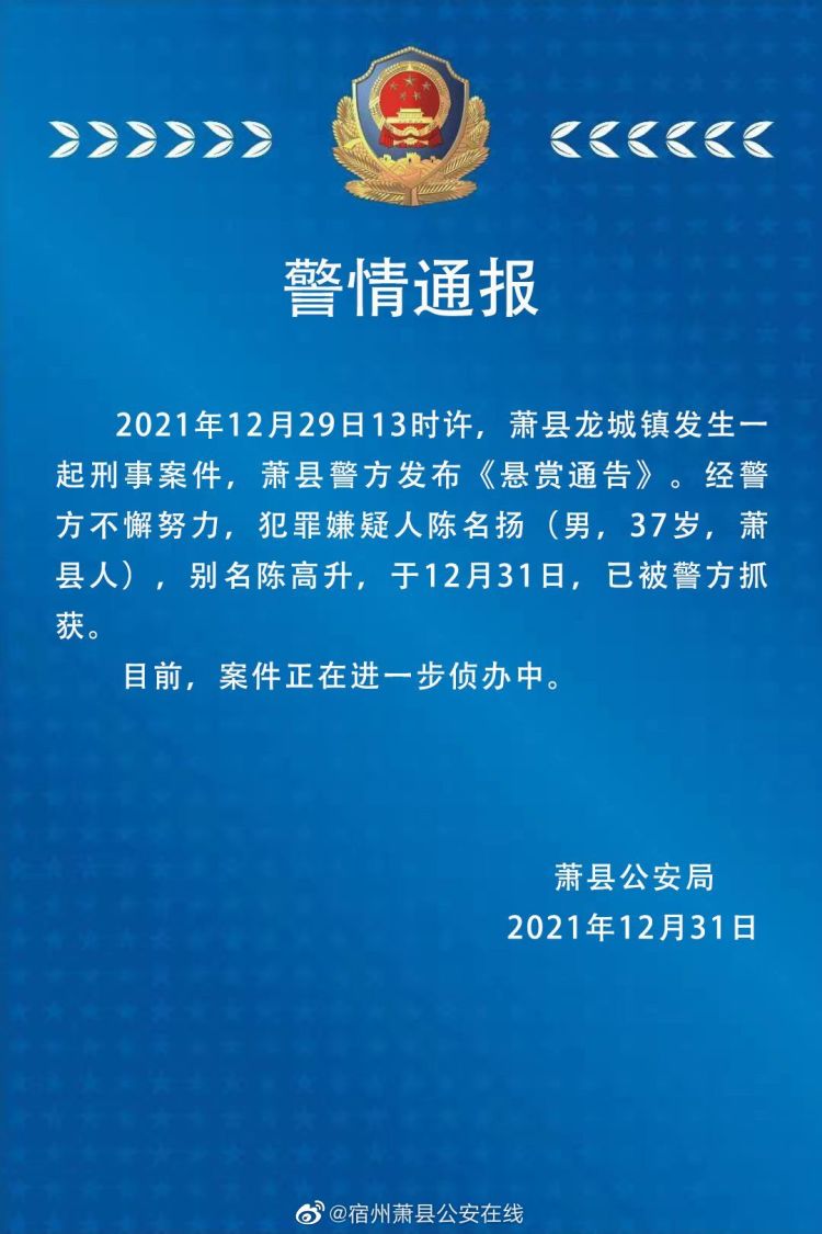 2021年12月29日13时许,萧县龙城镇发生一起刑事案件,萧县警方发布《悬赏通告》。经警方不懈努力,犯罪嫌疑人陈名扬(男,37岁,萧县人) ,别名陈高升,于12月31日,已被警方抓获。