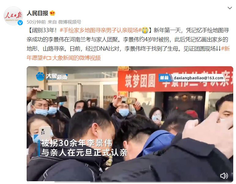 新年第一天,凭记忆手绘地图寻亲成功的李景伟在河南兰考与家人团聚。李景伟约4岁时被拐,此后凭记忆画出家乡的地形、山路寻亲。日前,经过DNA比对,李景伟终于找到了生母。见证团圆现场↓