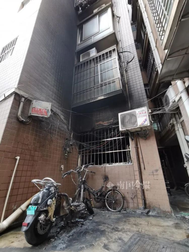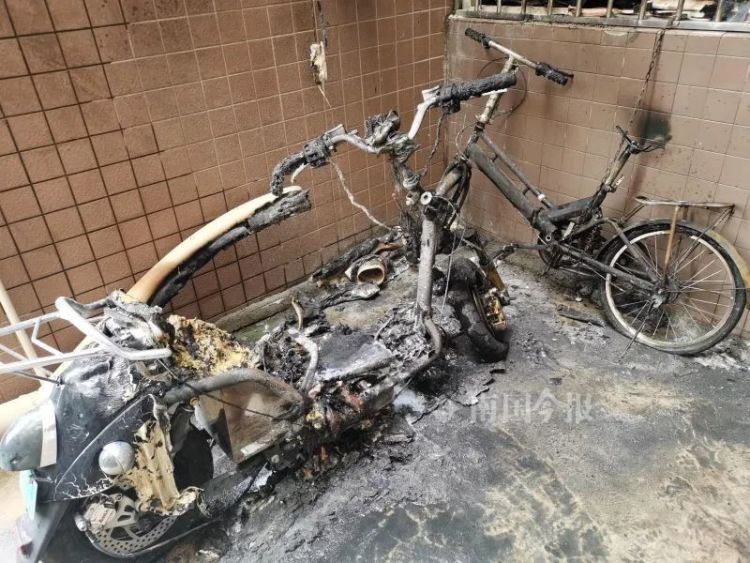 上午10时许,记者接报赶到现场,看到张先生家窗户外一辆黑色的电动自行车几乎被完全烧毁,只剩下车尾的外壳和后轮。更靠近窗户的一辆折叠自行车,也在火灾中受损严重。
