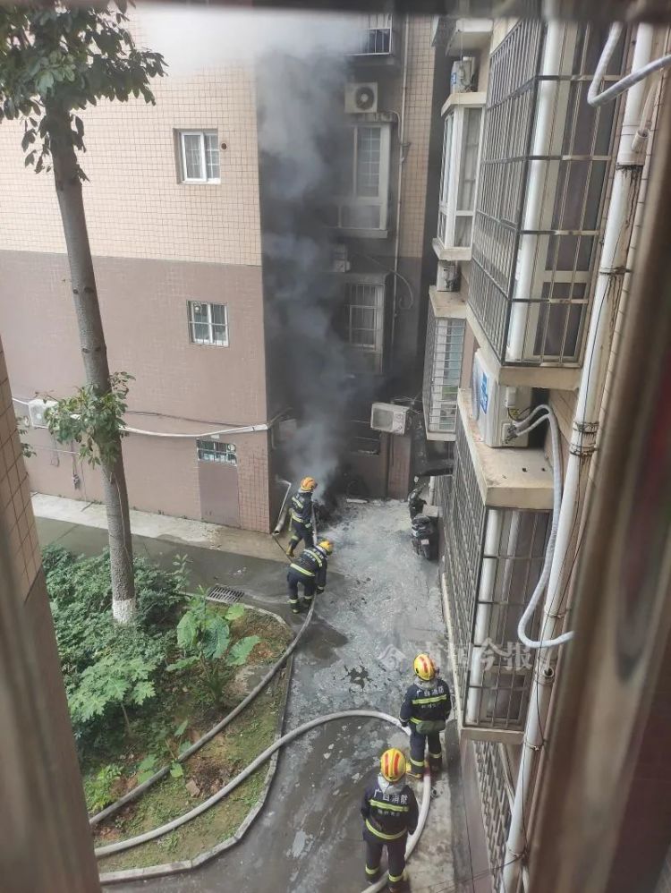 上午9时左右,消防队员赶到现场,接上水带,用消防水枪向着失火电动车和张先生家中喷射。大约10分钟后,大火被完全扑灭。小区物业服务人员来到现场,配合消防部门对失火原因展开调查。