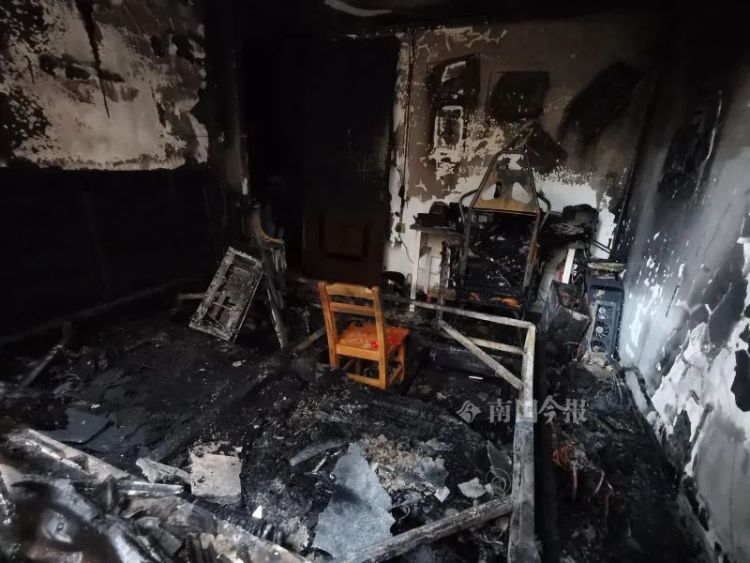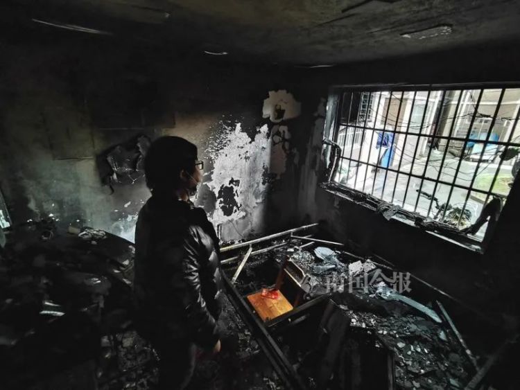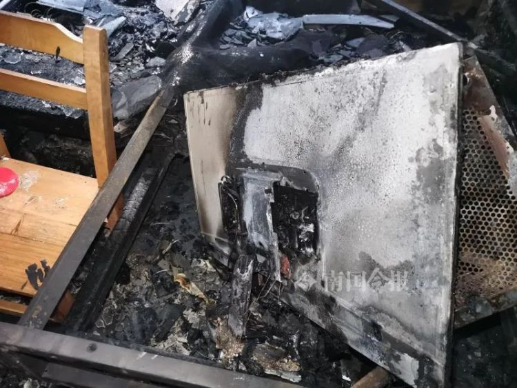 记者进入屋中看到,放在失火房间外的冰箱,因高温炙烤已有些变形,房间门外全部的天花板和大片墙面已被浓烟熏黑。张先生说,儿子的电脑配置比较高,仅主机就花了1万多元,妻子在床垫下还放的一些现金,现在都已化为灰烬,这场火造成的损失还真不小。