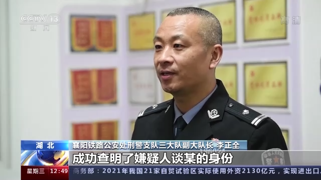 襄阳铁路公安处刑警支队三大队副大队长 李正全:我们通过调取列车和车站里的公共视频,找到了这名嫌疑男子的踪迹,成功查明了嫌疑人谈某的身份,最终将其抓获归案。