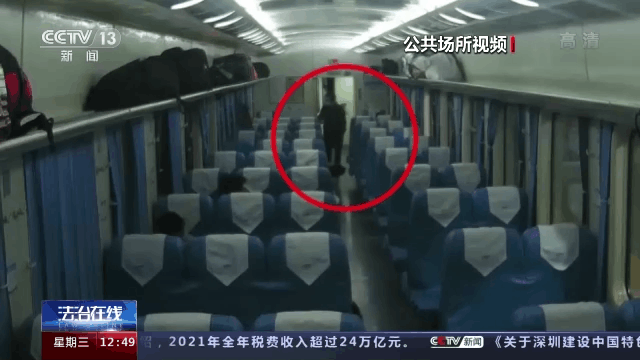 画面中这名男子就是犯罪嫌疑人,早上6点左右,当K935次旅客列车快要到达衡阳站的时候,他开始行动了。从画面中可以看到,这名嫌疑男子进入这节车厢以后,就开始打量周围的旅客,很快他就发现了目标。