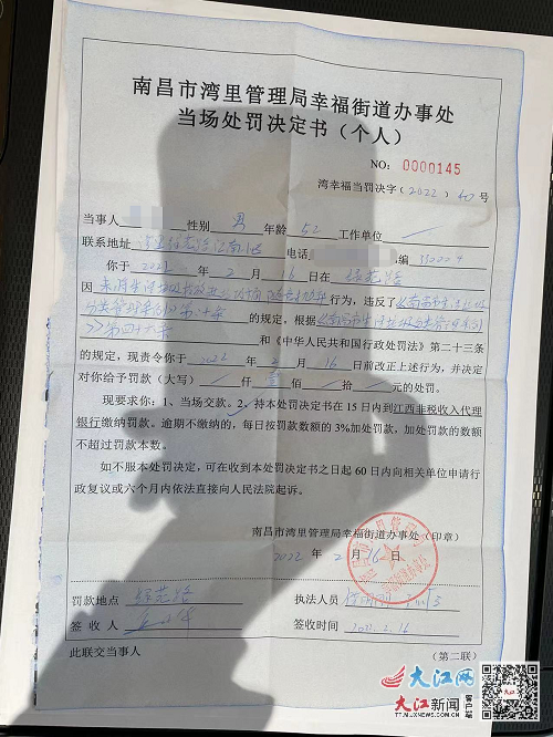 根据遗留下来的快递单据及外卖点餐小票,执法工作人员很快找到了乱扔垃圾的该居民房号,并上门对其进行普法教育,告知当事人,其行为违反了《南昌市生活垃圾分类管理条例》(以下简称《条例》)第四十六条规定,对该涉事居民作出罚款人民币100元 的行政处罚决定。