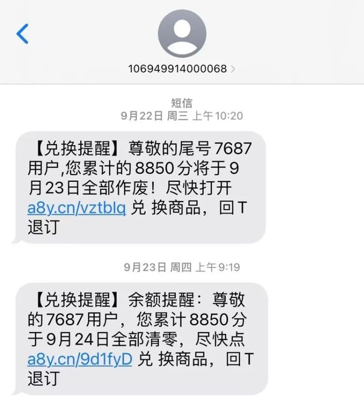 “【兑换提醒】尊敬的尾号7687用户,您累积的8850分将于9月23日全部作废!尽快打开a8y.cn/vztblq兑换商品,回T退订”。