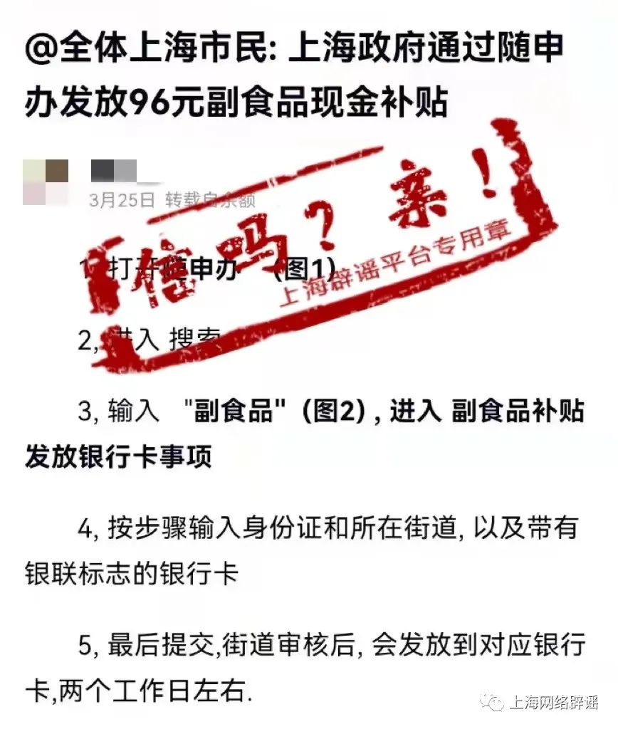 近日,有一则网传消息称,全体上海市民可以通过随申办领取96元的副食品现金补贴,还提供了领取步骤的说明,如在随申办搜索“副食品价格补贴发放银行卡维护”事项,提交个人信息,经街道审核两个工作日就能到账。不少市民信以为真。