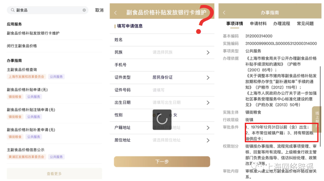 另据上海辟谣平台核查,在随申办App搜索“副食品价格补贴”,可以看到一系列办理指南,如副食品价格补贴补差申请、凭帮困粮油供应卡享受的副食品价格补贴申请,市民可对应了解审批条件的基本情况。