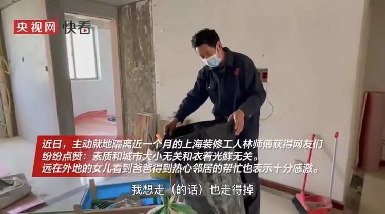 直到央视报道了他在过去一个多月间的经历后,林志宽的女儿才终于相信了父亲之前所说的。她说父亲能遇到这么热心的邻居,实在是他的幸运。 而在邻居们看来,作为一名普普通通的建筑工人,林志宽的心中装着大爱。他中途其实有过一次离开的机会,那是在他被困10天左右时,小区曾短暂开放过两个小时。但他选择留下——因为核酸报告还没有拿到。 “万一我感染了,出去以后传给别人,那得害多少人?”那天,他在小区大门口站了一会儿,心中斗争了一番。最后走进小超市里,拎了一袋大米和一大包干腐竹,回去了。