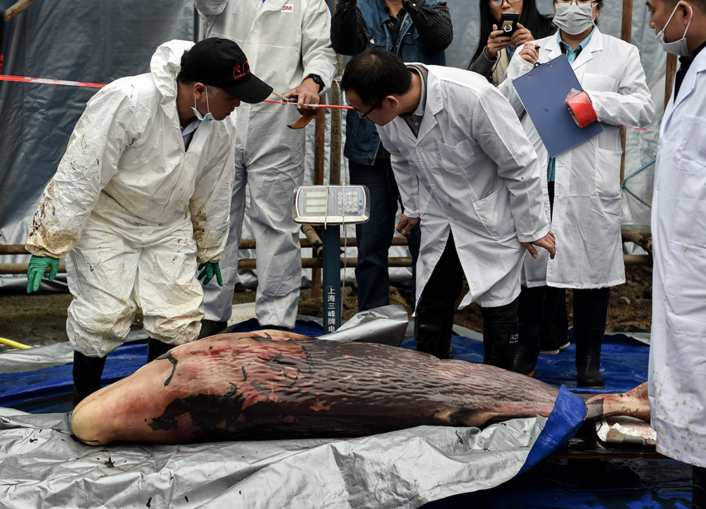 2017年3月15日,一头抹香鲸搁浅在广东惠州附近海域,最后死亡,救援人员在它的口中掏出了很多渔网线和塑料袋等垃圾。