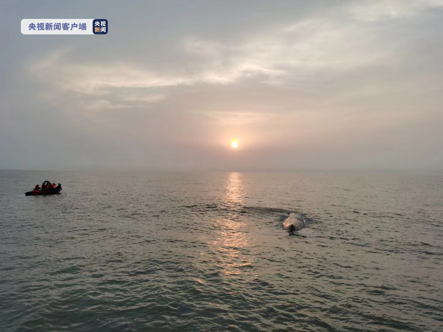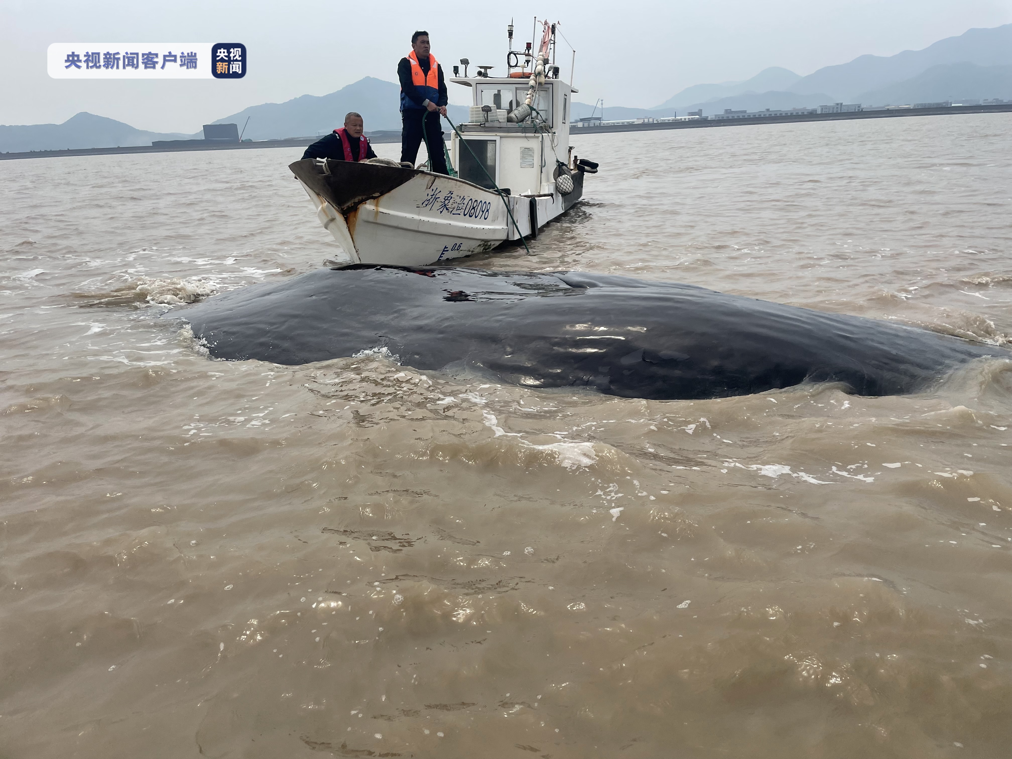 19日上午,一条长约20米的抹香鲸在浙江宁波象山县附近海域搁浅,当地渔政和渔民展开救援。20日早上5时20分左右,在渔政船的牵引和护航下,搁浅的抹香鲸成功抵达目的海域,渔政船切断牵引绳将抹香鲸成功放归大海。