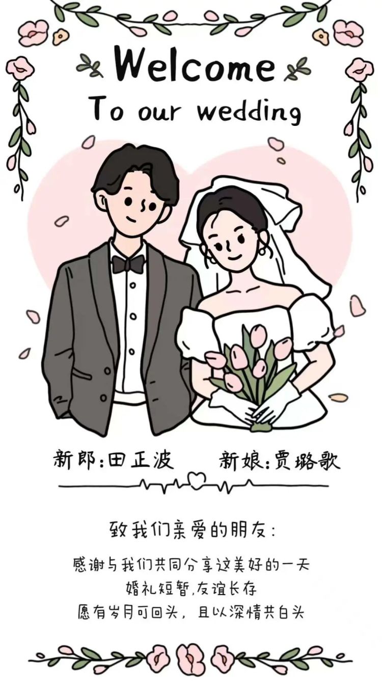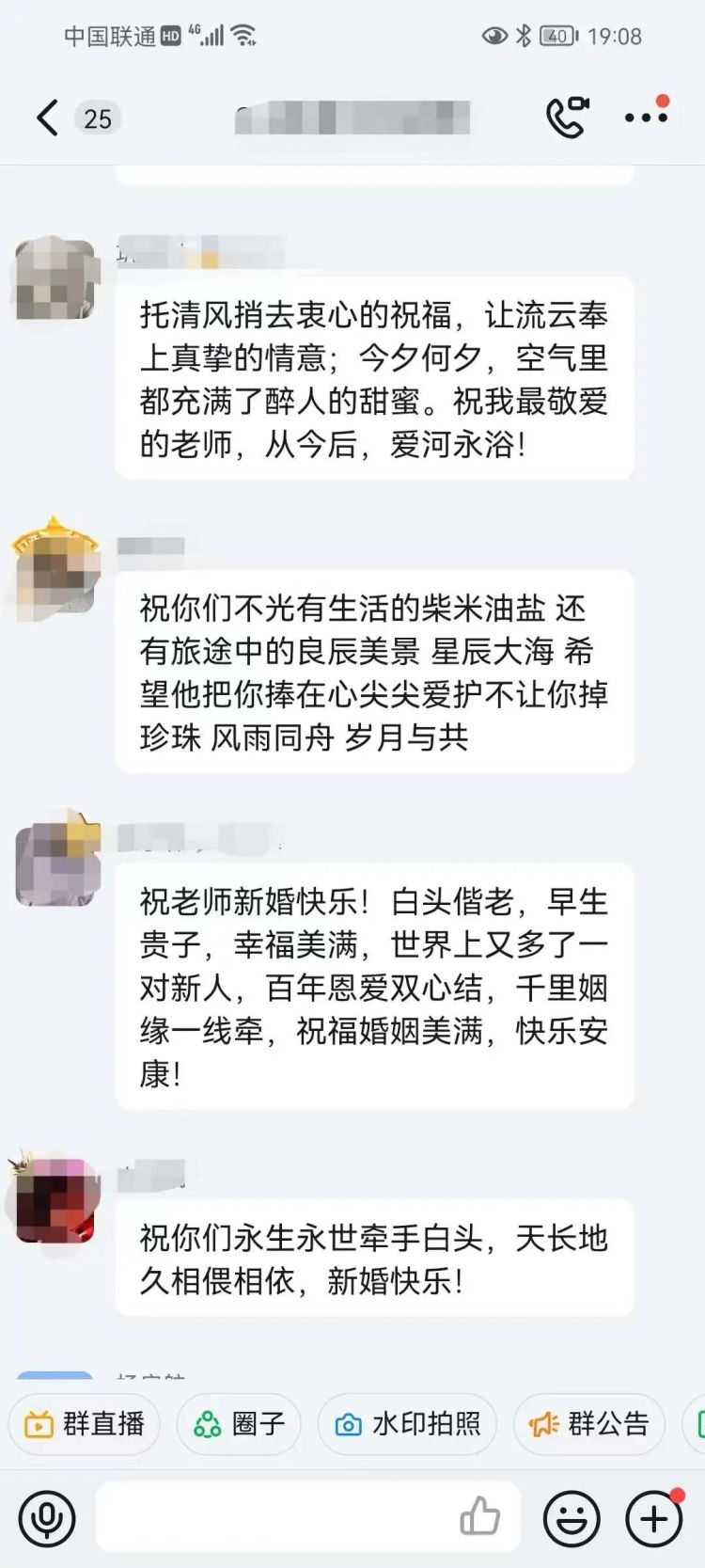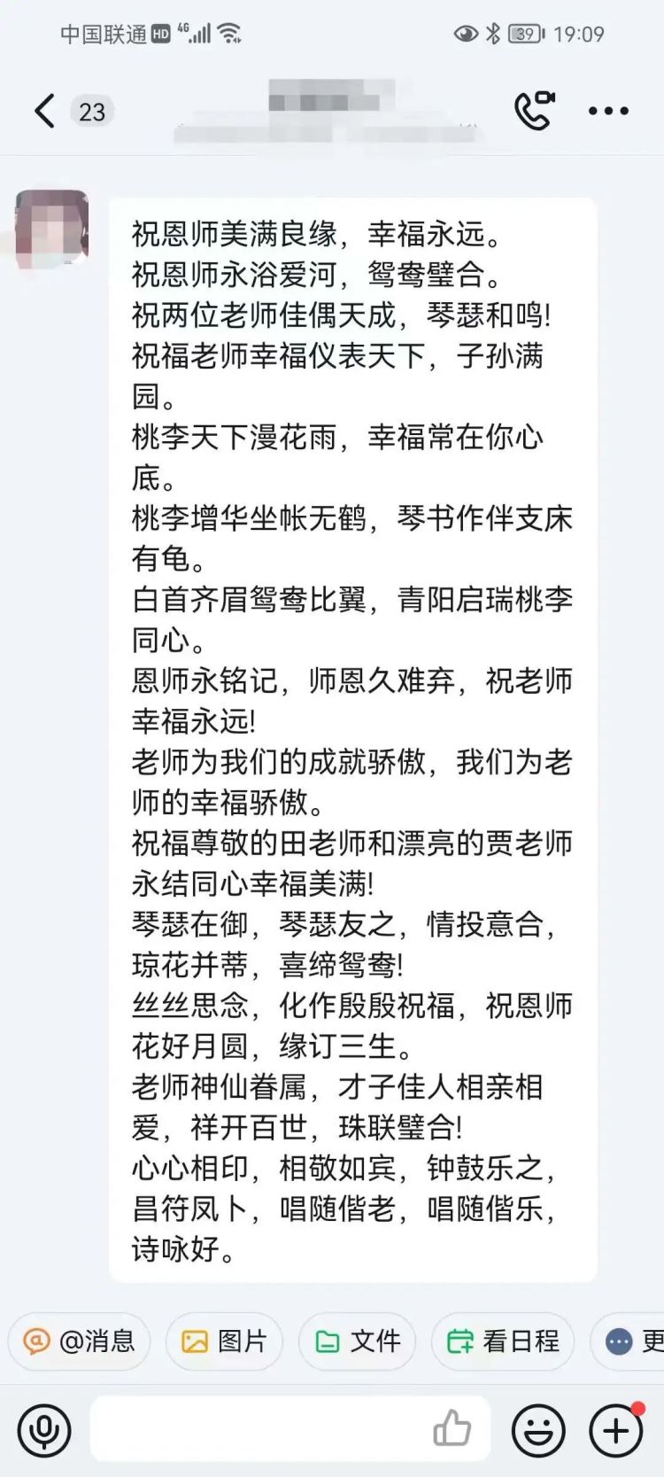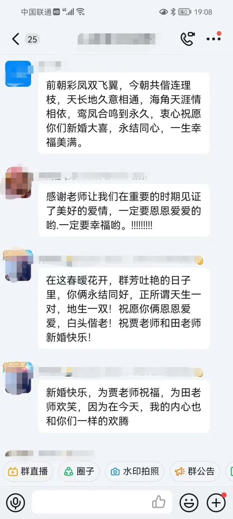 在得知两位老师结婚后,新郎田正波和新娘贾璐歌的学生们纷纷发来祝福,有的做了电子手账,有的画了漫画,有的做了电子贺卡,还有不少学生在班级群给老师发了祝福语……