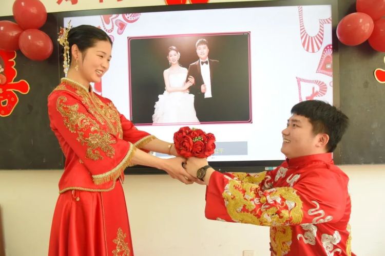 虽然没有了接亲队伍的锣鼓声响,也没有亲朋好友的到场祝福,但是他们的爱意依旧浓浓,脸上洋溢着幸福的笑容。三尺讲台作舞台,一间宿舍成洞房。他们特殊的婚礼,给校园带来很多浪漫情怀。